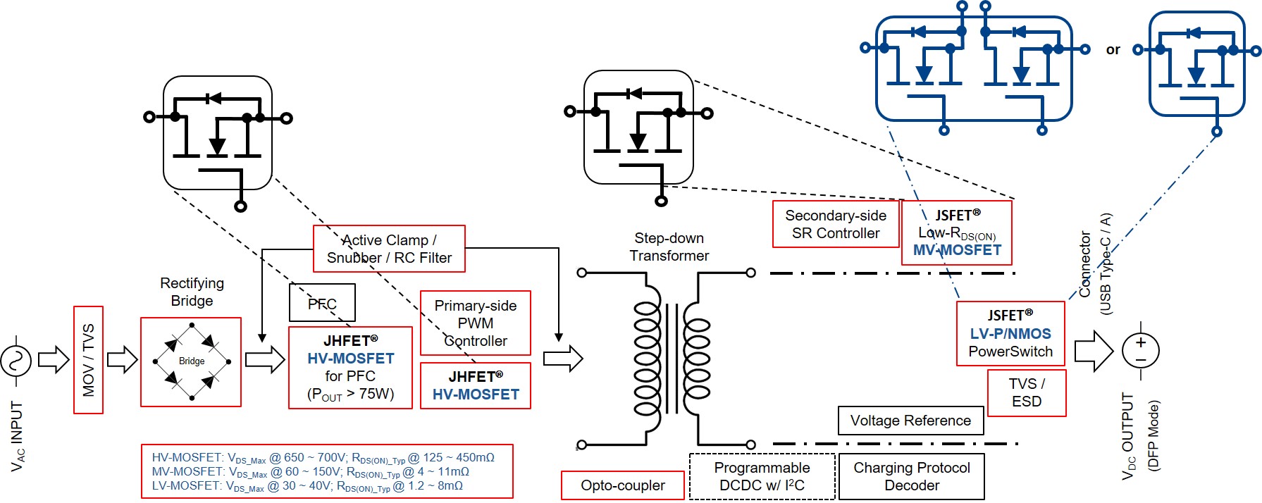 輸出功率從 18W 到 100W (甚至 120W 或更大) 、支持快充協(xié)議 (USB PD3.0/3.1, USB BC1.2, UFCS T/TAF 083-2022, Qualcomm QCxx, MediaTek PExxx、Huawei S/FCP, Oppo D/FCP, Samsung AFC, Apple 2.4A, …)、配置一個(gè)或多個(gè) USB Type-A 及 Type-C 輸出接口的快充充電器日益普遍。它們可以一物多用,同時(shí)為智能手機(jī)、平板、智能手表及筆記本電腦等萬(wàn)物互聯(lián)數(shù)字化終端里面的鋰電池快速充電。采用第三代半導(dǎo)體功率器件(氮化鎵 D/E-mode HEMT)的設(shè)計(jì),體積小巧以及使用時(shí)溫度不會(huì)燙手,由于因近年多家世界排名前列的智能手機(jī) OEM 不把充電器隨著新款手機(jī)一起標(biāo)配而形成曲棍球棒效應(yīng),使得這類(lèi)小巧的快充充電器成為市場(chǎng)主流。 市場(chǎng)上的快充充電器,常用的交直流電源轉(zhuǎn)換拓?fù)涫?Flyback 及 LLC。Flyback 拓?fù)涑R?jiàn)于功率比較小的設(shè)計(jì),LLC 拓?fù)鋭t常見(jiàn)于功率較大及對(duì)交直流電源轉(zhuǎn)換效率要求較高的設(shè)計(jì)。因?yàn)?BOM 相對(duì) LLC 拓?fù)浔容^簡(jiǎn)單,ACF-Flyback 拓?fù)湟查_(kāi)始被中/小功率的設(shè)計(jì)采用,特別是初級(jí)使用高壓氮化鎵 HEMT 的設(shè)計(jì)。無(wú)論是那種拓?fù)?,快充充電器的?nèi)部結(jié)構(gòu)示意圖大概如上: 針對(duì)快充充電器的成用,捷捷微電 能提供完整的分立器件解決方案。比如,AC 輸入端防浪涌的 MOV、TVS、鉗制變壓器漏感而對(duì)原邊的高壓 MOSFETs VDS_Max 產(chǎn)生過(guò)壓的快恢復(fù)整流管、原邊 PFC (75W 以上的設(shè)計(jì)) 和匹配 PWM 的高壓 MOSFET、副邊同步整流中/低壓 MOSFETs、USB Type-A 及Type-C 端口的低壓 MOSFETs 及 ESD 保護(hù)等。