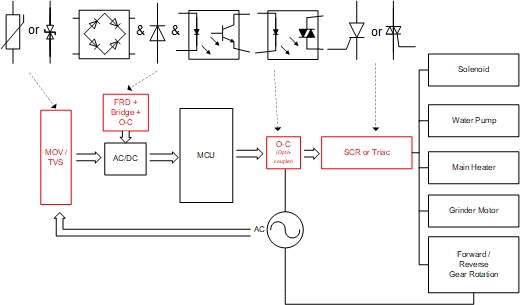 人們把電子技術(shù)應(yīng)用到咖啡機(jī)上,實(shí)現(xiàn)了磨粉、壓粉、裝粉、沖泡、清除殘?jiān)柔勚瓶Х热^(guò)程的自動(dòng)控制,創(chuàng)造了全自動(dòng)電子咖啡機(jī)。 應(yīng)用于消費(fèi)電子領(lǐng)域,捷捷微電 能提供比較齊全的元件解決方案。比如:AC 輸入端防浪涌的壓敏電阻(MOV)、電源部分用快恢復(fù)二極管(FRD, fast recovery diode)及整流橋(Bridge)、光電隔離器件(Opto-coupler)、控制負(fù)載通斷的可控硅(SCR & Triac)等。
