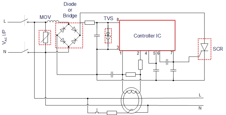 漏電保護器,簡稱漏電開關,又叫漏電斷路器,主要是用來在設備發(fā)生漏電故障時以及對有致命危險的人身觸電保護,具有過載和短路保護功能,可用來保護線路或負載的過載和短路,亦可在正常情況下作為線路的不頻繁轉換啟動之用。 目前市場上使用的漏電保護裝置種類繁多,但大體的原理都相差不大。漏電保護器主要是由三部分組成:檢測元件、中間放大環(huán)節(jié)、操作執(zhí)行機構 1. 檢測元件:由電流互感器組成,檢測漏電電流并發(fā)出信號 2. 放大環(huán)節(jié):將微弱的漏電信號放大,按裝置不同可采用機械式或電子式 3. 執(zhí)行機構:收到信號可控硅由斷開狀態(tài)變?yōu)閷顟B(tài),主線圈通電后,主開關由閉合狀態(tài)轉換為斷開狀態(tài),從而切斷電源 應用于漏電保護器領域,捷捷微電 能提供比較齊全的元件解決方案。比如:AC 輸入端防浪涌的壓敏電阻(MOV)、對交流進行整流的高壓整流二極管 (Diode) 或者是整流橋(Bridge)、對電源端進行過壓防護的瞬態(tài)抑制二極管(TVS)、整個電路的控制核心集成電路(IC)、電路動作執(zhí)行機構(SCR)等。