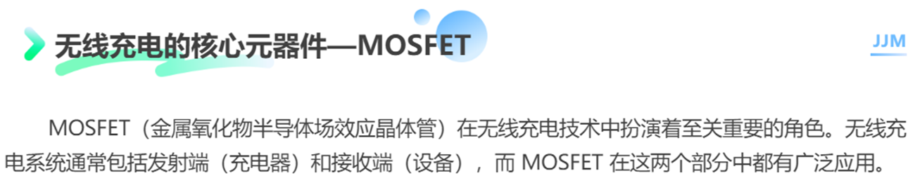 MOSFET(金屬氧化物半導(dǎo)體場效應(yīng)晶體管)在無線充電技術(shù)中扮演著至關(guān)重要的角色。無線充電系統(tǒng)通常包括發(fā)射端(充電器)和接收端(設(shè)備),而 MOSFET 在這兩個(gè)部分中都有廣泛應(yīng)用。