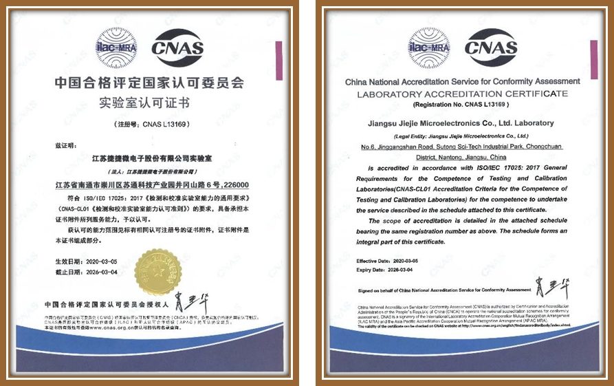 江蘇捷捷微電子股份有限公司實驗室測試中心,提供多種可靠性試驗,包括環(huán)境可靠性測試、板級可靠性試驗,使用壽命可靠性測試和全方位的失效分析服務。 捷捷微電子股份有限公司實驗室已經獲得中國合格評定國家認可委員會的實驗室認可證書(CNAS認證) 江蘇捷捷微電子股份有限公司實驗室測試中心成立于 2011 年,分南通、啟東、深圳3個測試場地?,F(xiàn)有工作人員50名,其中管理人員 5 名,檢測人員 45名,簽字授權人4名,中級職稱人員2名,助理職稱人員6名,本科學歷人員21名。實驗室占地面積2000平方米,南通1200平方米,啟東800平方米。2018年8月發(fā)布并實施實驗室管理體系,并在2020年3月取得CNAS實驗室認可證書(L13169)。實驗室現(xiàn)有各類設備近170臺,可開展可靠性試驗項目20余項,浪涌過電壓檢測項目10余項,失效分析10余項以及特性測試等項目。與中科院微電子所、西電、中車等單位存在長期合作關系。